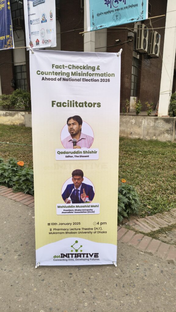 Dhaka, January 10, 2025 — With the National Election of Bangladesh scheduled for February 2026, Dot Initiative organized a workshop titled “Fact-Checking & Countering Misinformation Ahead of National Election 2026” at the University of Dhaka to raise awareness among students about misinformation, disinformation, and responsible digital engagement.